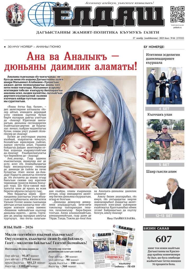 Кумыкская газета «Ёлдаш» №44 от 27 ноября 2025 г.