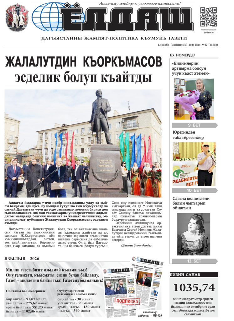 Кумыкская газета «Ёлдаш» №42 от 13 ноября 2025 г.