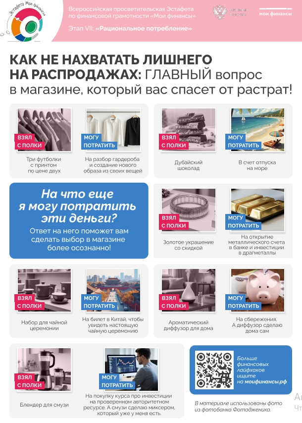 Этап «Рациональное потребление» предлагает полезные практики. Эксперты научат отличать реальные выгоды от маркетинговых уловок. Участники узнают, как бороться с импульсивными тратами. Также речь пойдет об осознанном шопинге.