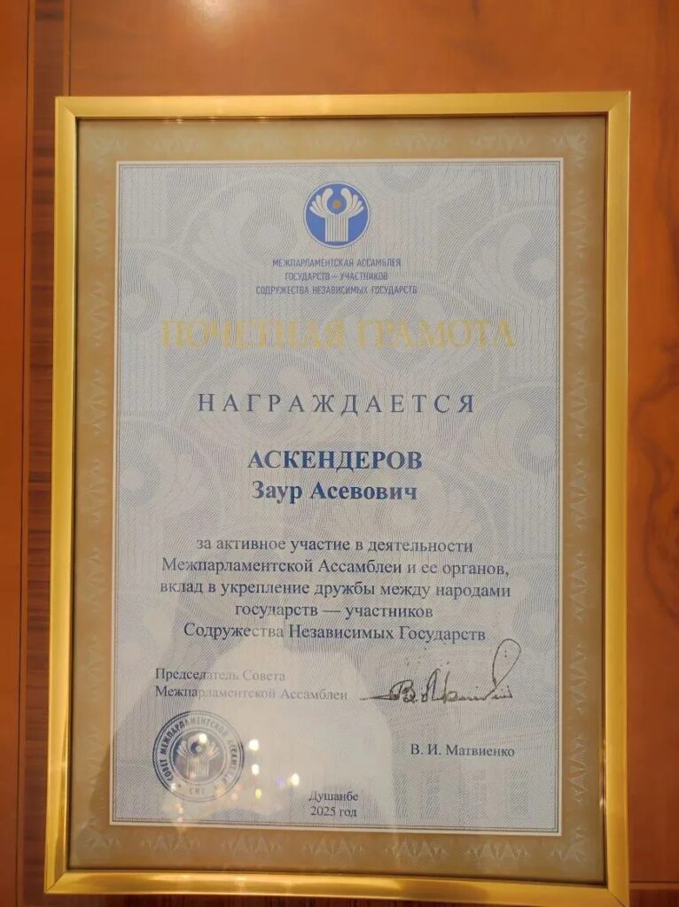 «Получить Почетную грамоту Межпарламентской Ассамблеи СНГ — большая честь для меня. Выражаю глубокую признательность Валентине Ивановне Матвиенко за высокую оценку. Она является Председателем Совета Федерации и Председателем Совета МПА СНГ», — сказал Заур Аскендеров.