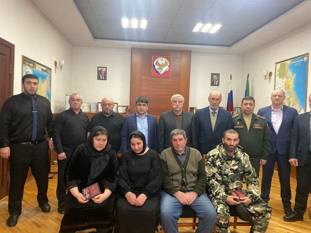 В администрации Табасаранского района собрались родные четверых военнослужащих, отдавших жизнь в спецоперации. Глава муниципалитета Магомед Курбанов передал им государственные награды, которыми бойцов отметили посмертно. Ферезулла Велиев награждён орденом Мужества, Абдулгамид Ханмагомедов и Усман Гереев — медалями Суворова, Магомед Магомедов — медалью Жукова.