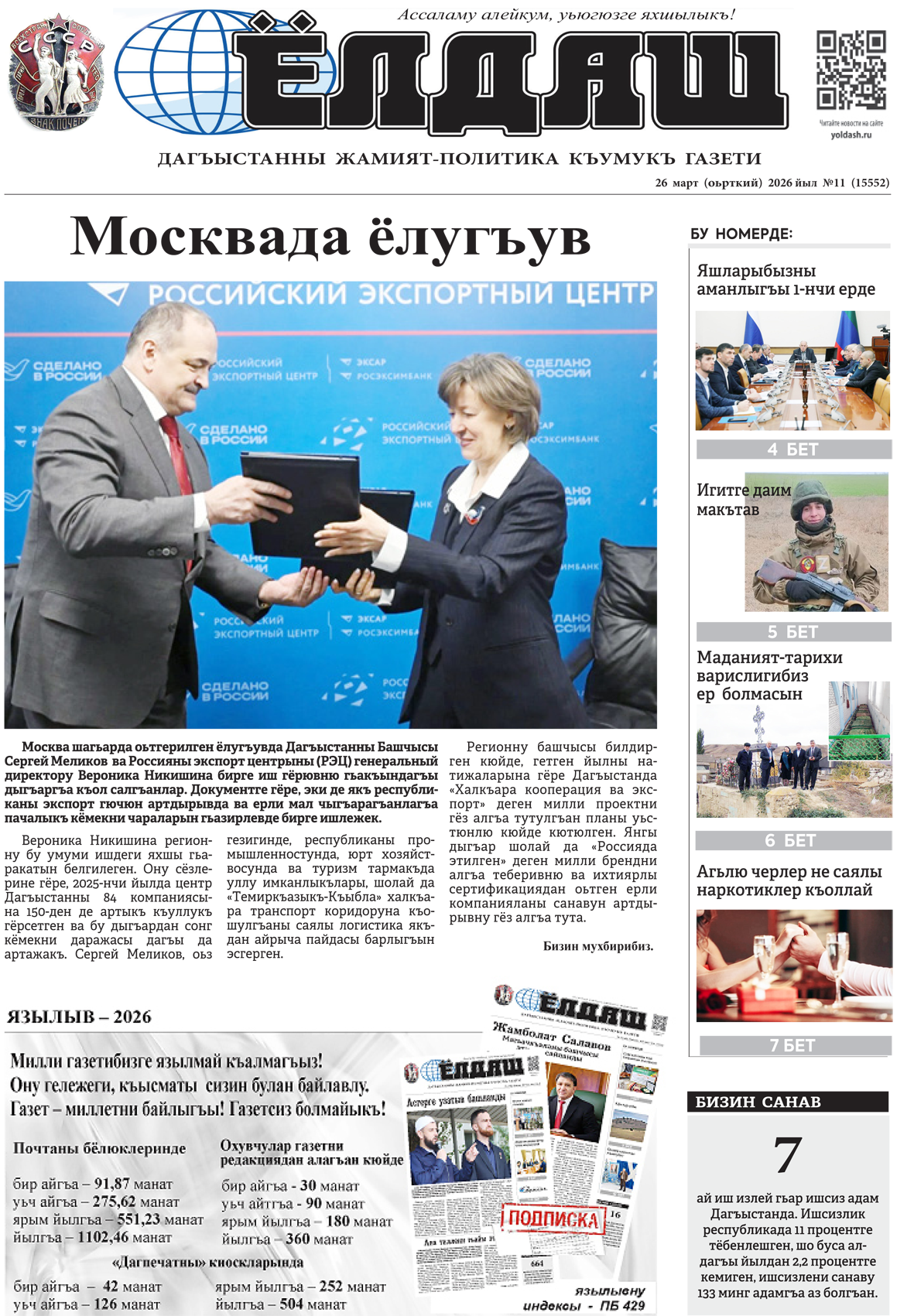 - Кумыкская газета «Ёлдаш» №11 от 26 марта 2026 г.