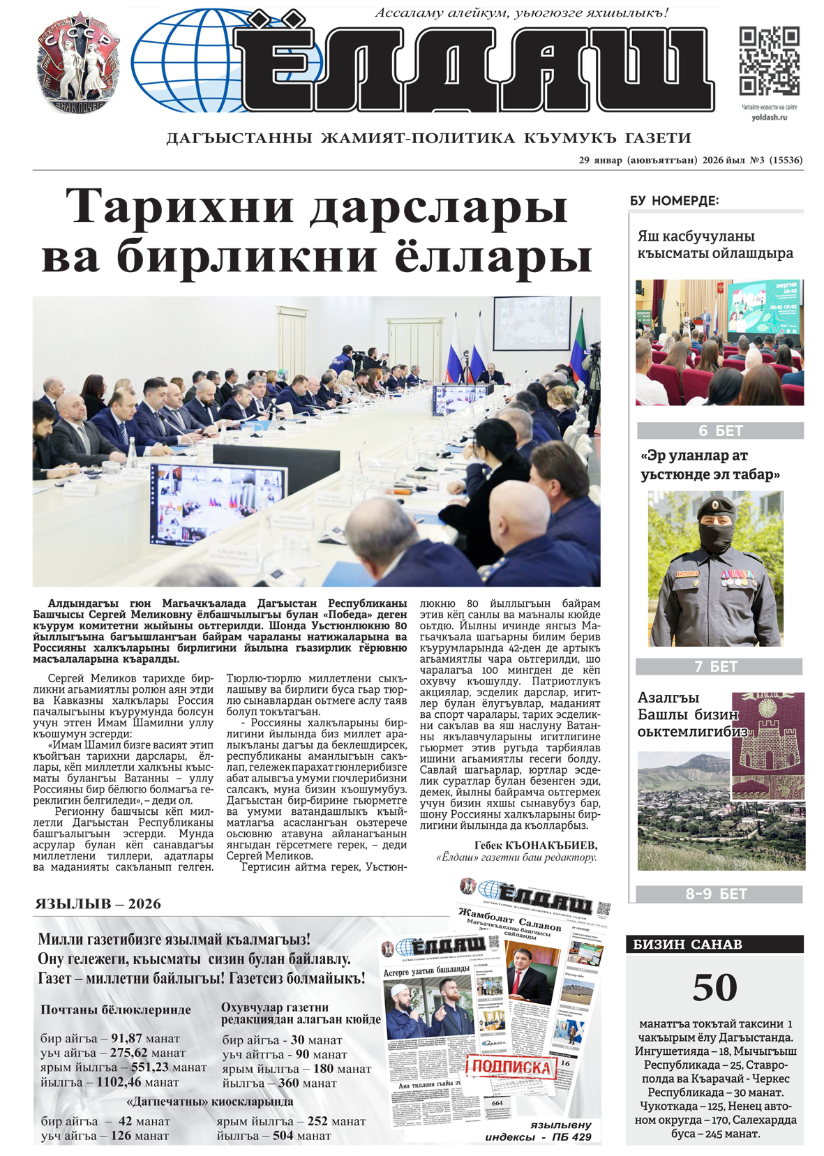 • Кумыкская газета «Ёлдаш» №1 от 15 января 2026 г.