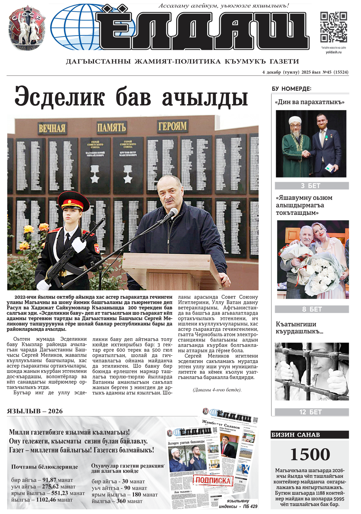 • Кумыкская газета «Ёлдаш» №44 от 27 ноября 2025 г.